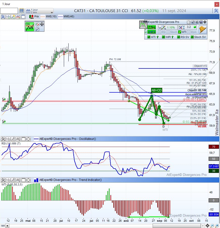 Une divergence haussière a été détectée par l’AtExpert Divergences Pro (WTI) sur CA TOULOUSE 31 en journalier. Cette divergence a été suivie par un signal supplémentaire :