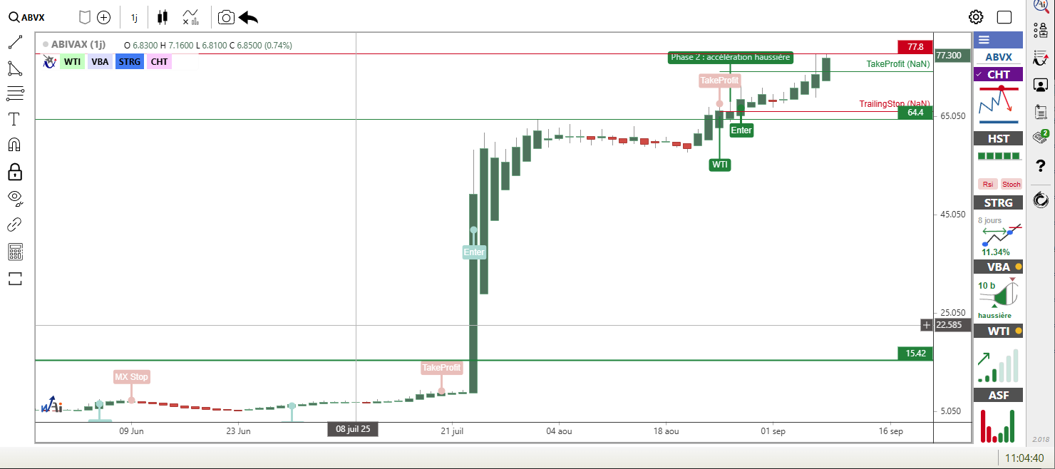 ABIVAX affiche une performance remarquable de +5.08% à 76.50 euros, soutenue par une dynamique technique favorable. La méthode VBA (Volatility Band Advisor) détecte une accélération haussière depuis 9 barres, tandis que la méthode STRG (Smart Trend & Range) confirme un signal avec un gain de 11.19%. La méthode ASF (Awesome Swing Force) indique une poursuite de tendance haussière depuis 2 barres. Cependant, la méthode WTI (Waldata Trend Indicator) révèle une tendance de fond haussière mais relativement faible avec une force d'environ 17%.