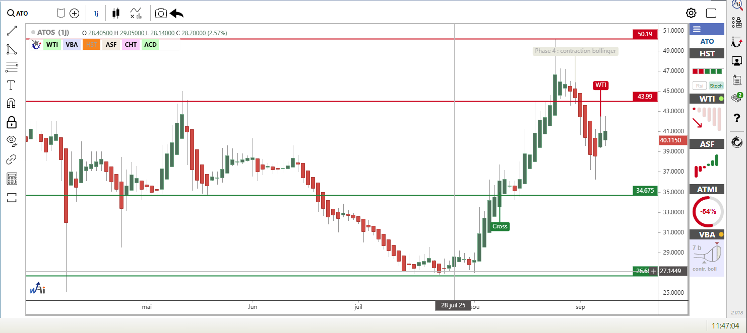 ATOS ressort à +3.82% à 41.17 euros, bénéficiant d'un environnement technique favorable. La méthode VBA (Volatility Band Advisor) observe une contraction des bandes de Bollinger haussière depuis 7 barres, tandis que la méthode ASF (Awesome Swing Force) confirme un changement de tendance haussier depuis 21 barres. La méthode WTI (Waldata Trend Indicator) révèle une tendance de fond baissière très faible avec seulement 3% de force, suggérant un possible retournement.