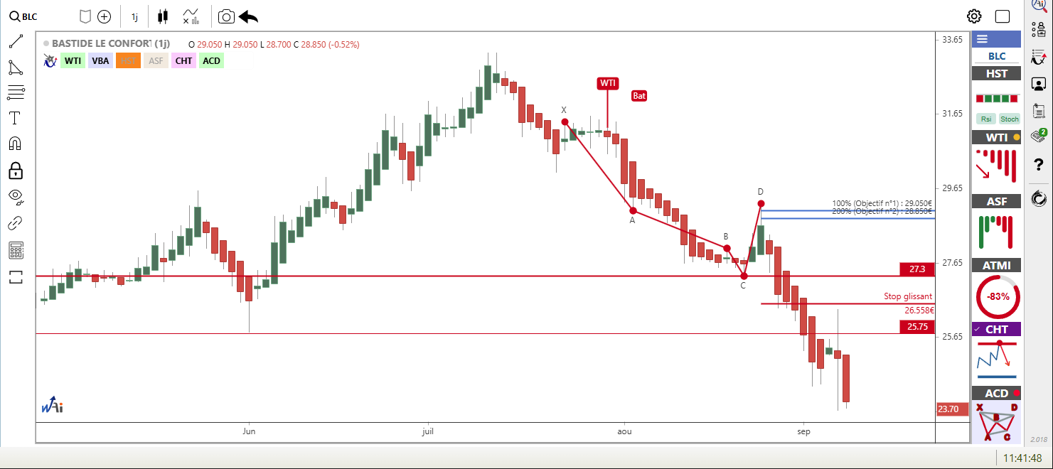 BASTIDE LE CONFORT MEDICAL recule de -5.88% à 24.00 euros avec une configuration technique particulièrement dégradée. La méthode ACD (AutoChartDecoder) détecte une figure 'Bat' baissière, confirmée par la méthode ASF (Awesome Swing Force) qui indique une poursuite de tendance baissière depuis 5 barres. La méthode HST (Heikin Ashi Swing Trading) affiche un swing baissier depuis 8 barres. La méthode WTI (Waldata Trend Indicator) révèle une tendance de fond baissière avec une force maximale de 98%.
