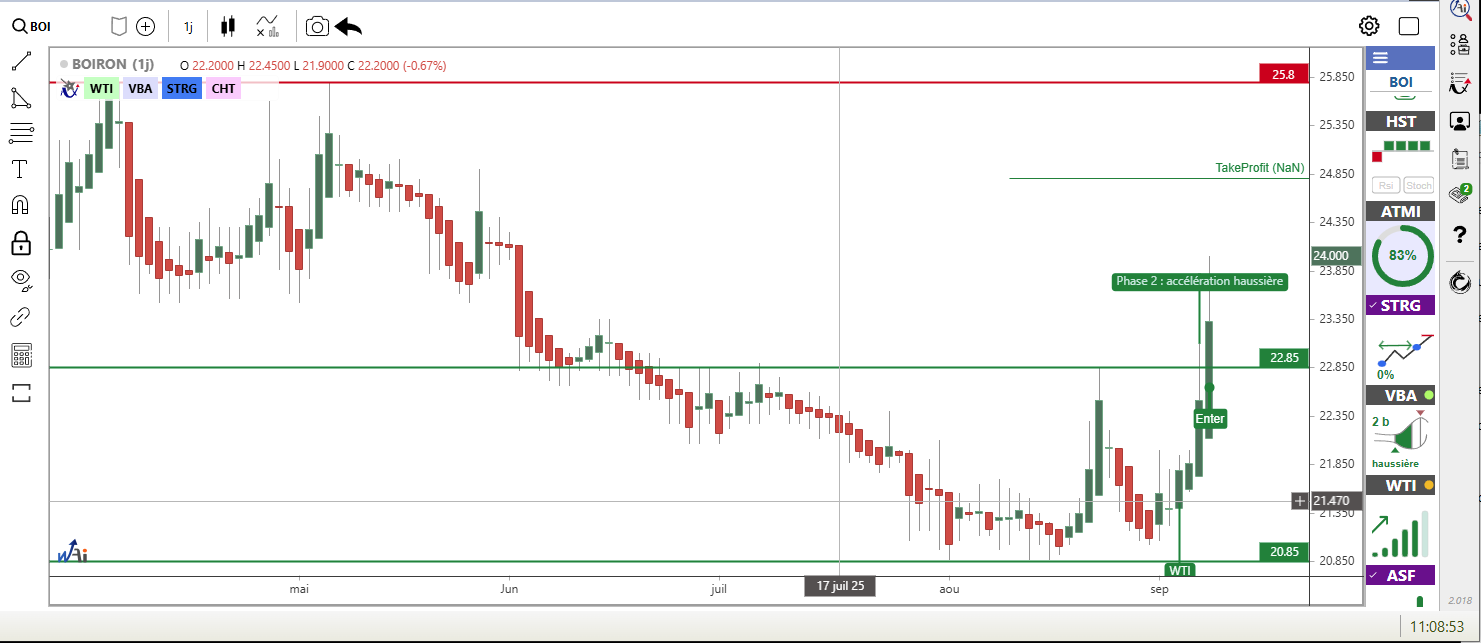 BOIRON progresse de +4.32% à 22.95 euros avec des signaux techniques encourageants. La méthode VBA (Volatility Band Advisor) identifie une accélération haussière depuis 2 barres, confirmée par la méthode ASF (Awesome Swing Force) qui détecte un changement de tendance haussier. L'analyse multi-indicateurs ATMI (Analyse Temps réel Multi Indicateur) montre que 83% des indicateurs sont haussiers. La méthode WTI (Waldata Trend Indicator) confirme une tendance de fond haussière avec une force de 69%.