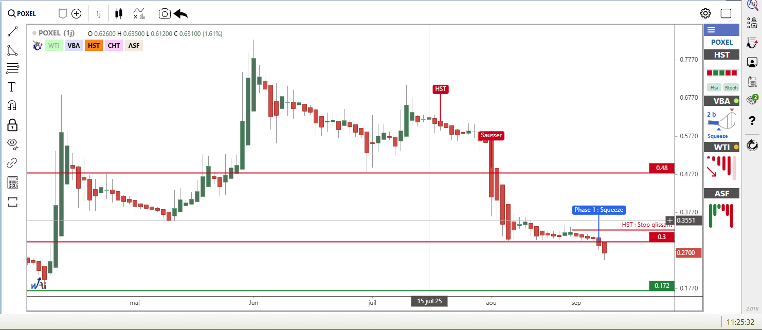 POXEL s'effondre de -6.95% à 0.2810 euro, pris dans une spirale baissière technique. La méthode VBA (Volatility Band Advisor) détecte un squeeze depuis 2 barres, tandis que la méthode ASF (Awesome Swing Force) indique une poursuite de tendance baissière depuis 20 barres. La méthode HST (Heikin Ashi Swing Trading) confirme un swing baissier depuis 29 barres. La méthode WTI (Waldata Trend Indicator) révèle une tendance de fond baissière avec une force de 70%.