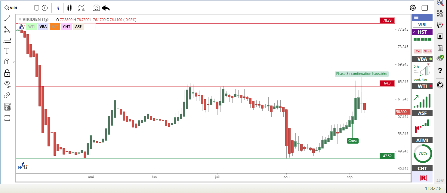VIRIDIEN recule de -6.33% à 58.45 euros, mais les signaux techniques restent optimistes. La méthode VBA (Volatility Band Advisor) identifie une continuation haussière depuis 2 barres, confirmée par la méthode ASF (Awesome Swing Force) qui détecte un changement de tendance haussier depuis 4 barres. La méthode WTI (Waldata Trend Indicator) confirme une tendance de fond haussière avec une force élevée de 92%, suggérant que cette baisse pourrait n'être que temporaire.