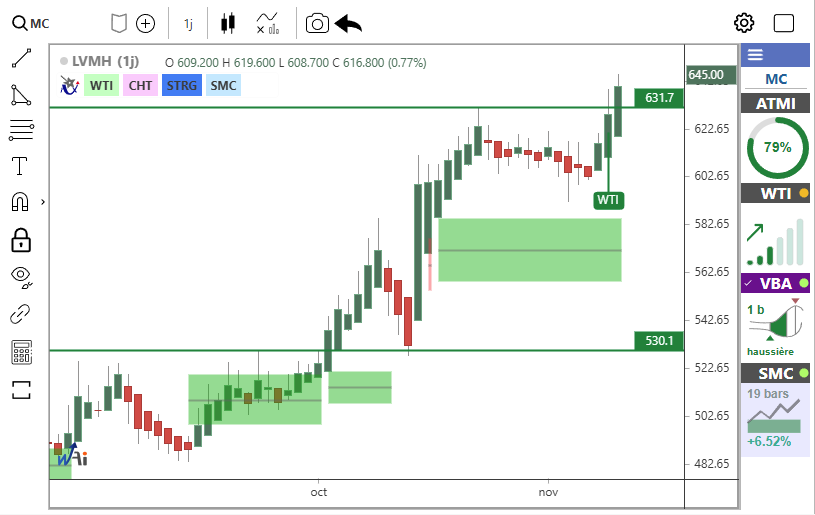 bénéficie d'une accélération haussière VBA sur 2 barres avec un timing favorable et un signal SMC prometteur depuis 3 barres.