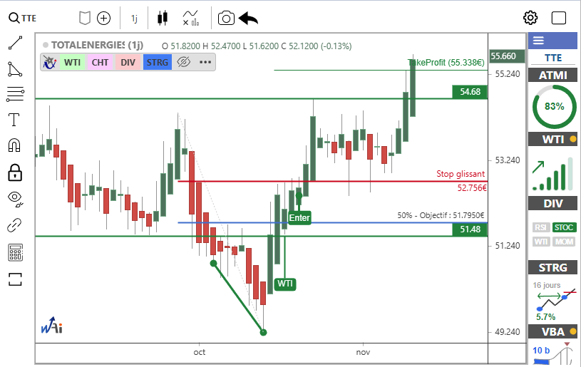 se distingue particulièrement avec la méthode STRG active depuis 15 bars (+5.11%), soutenue par une divergence haussière détectée par la méthode DIV sur le Stochastique depuis 20 barres. Dans l'énergie, la méthode WTI confirme une tendance haussière avec une force de 69%.