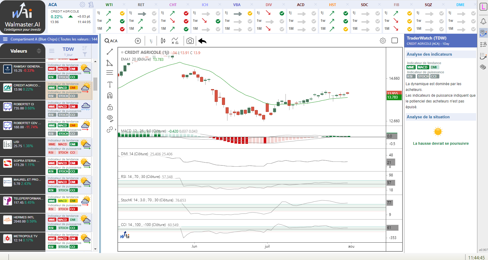 L’ensemble de ces informations sont analysées et montrent instantanément si la valeur se situe dans une phase haussière où la tendance est en train de changer.